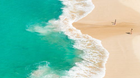 Sandy coastline washed by turquoise foamy sea