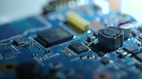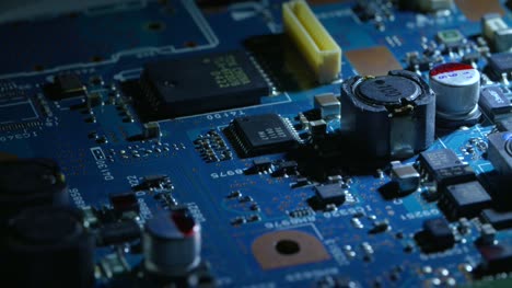 A macro tracking shot over a blue circuitboard.
